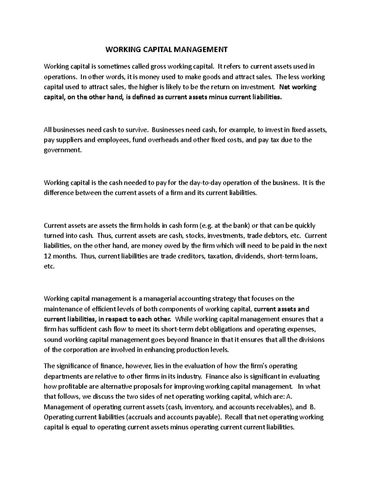 Econ 321 Working Capital Management Working Capital Management Working Capital Is Sometimes Called Studocu